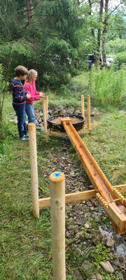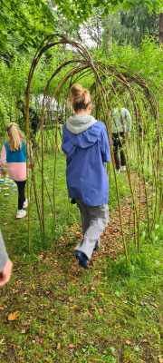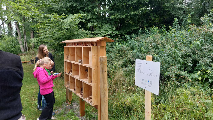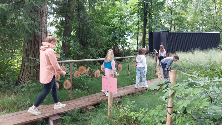 Zu Beginn des Schuljahres 24/25 entstanden in jahrgangsgemischten Expertengruppen an zwei Vormittagen auf dem Blyb-Geländeviele tolle Ideen, was die Schulkinder gerne in der Natur machen, erleben, experimentieren, langfristig verfolgen, neu entdecken und bauen würden. In einem weiteren Schritt einigten wir uns in unserer großen Schulfamilie zusammen mit neu gewonnenen oder bereits bewährten Experten auf 8 Stationen, die dann über das ganze Schuljahr hinweg entstanden. Jede Klasse machte eine Station zu ihrem Jahresprojekt: 1a: Insektenhotel, 1b Barfußpfad, 2a Vogelnistkästen, 2b Kräuter und essbare Blumen, 3a Naturbeobachtungsplattform, 3b Weidentunnel und Tippis, 4a Kugelbahn und 4b Wasserbahn. In seinem sehr partizipativen, demokratischen und Selbstwirksamkeit erlebenden Prozess wurden an allen Stationen Ideen für die Umsetzung gesammelt, diskutiert, Pläne entworfen und gezeichnet und dann sehr tatkräftig und mit Unterstützung einiger erwachsenen Hände „Hand angelegt“, gesägt, gebohrt, geschraubt, gepflanzt, experimentiert, geschaut und beobachtet. Etliche Vormittage verbrachten zum Teil mehrere Klassen gleichzeitig auf dem riesigen Areal des Blyb, um an ihren Projekten zu arbeiten. Oft wurde dazu auch das grüne Klassenzimmer genutzt, welches uns wie auch alle 8 Stationen weiterhin zur Verfügung steht und sicher im nächsten Schuljahr noch häufiger für „normalen“ Unterricht genutzt werden wird. Mit dem großen Einweihungsfest wurde zwar ein gewisser Projektabschluss gefeiert, das ganz Besondere an diesem Projekt aber ist, dass es am Schluss nicht „in den Schrank gestellt wird und dort verstaubt“, sondern im nächsten Schuljahr weiter wachsen, sich verändern und entwickeln darf. Da es sich ja um ein öffentlich zugängliches Gelände handelt, dürfen neben den Grundschülern und ihren Familien natürlich auch alle Gäste und sonstigen Interessierten über den Sommer diesen Naturerlebnispfad bewundern und bespielen.