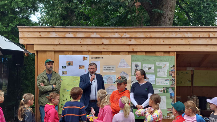 Ende Juli – eine Woche vor Schulschluss des Schuljahres 24/25 – wurden tatsächlich alle 8 Stationen des Natur-Erlebnispfads vollendet und wir konnten alle zusammen (Schulkinder, Eltern, Lehrkräfte der Grundschule, Blyb-Mitarbeiter, Sponsoren und viele weitere Freunde und Förderer unserer Schule wie unser 1. Bürgermeister Alfons Besel) am 25. Juli ein großes Einweihungsfest feiern. Viele Eltern, Experten, Helfer, Sponsoren und Interessierte und natürlich alle 184 Kinder und ihre Lehrkräfte waren gekommen um dieses nachhaltige Projekt „Natur-Erlebnispfad“ zu feiern. Bevor alle Stationen ausgiebig begutachtet und bespielt werden durften, erzählten die jeweiligen Experten der 8 Stationen noch kurz etwas über den jeweiligen Entstehungsprozess und Susanne Riedl, Florian Ziebert und Alfons Besel freuten sich gemeinsam ebenfalls in einer kurzen Ansprache über diese Win-Win-Win Situation für alle Beteiligten..