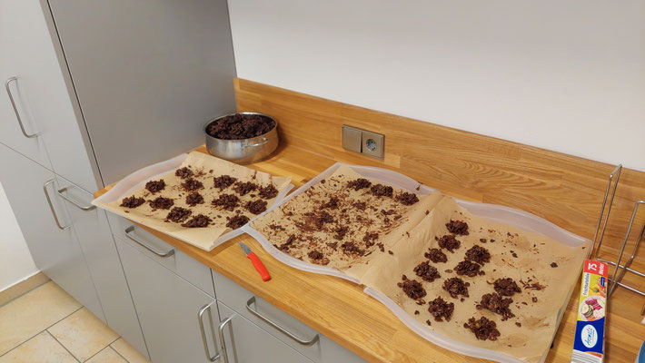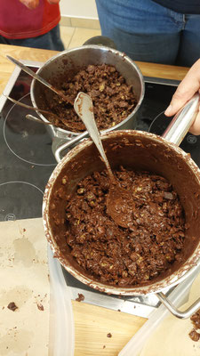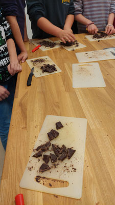 Während der Herstellung "fachsimpelten die Schokoladenköche" über faire Preise, über den langen Herstellungsprozess und damit faire Löhne, über den Kakaoabbau und vieles mehr. Außerdem erfüllten sie das gesamte Schulhaus mit warmem Schokoladenduft. Die Crossies waren bei beiden Veranstaltungen die Verkaufs-Schlager. Vielen Dank an alle, die zum Gelingen dieses Fairen Projekts beigetragen haben,.