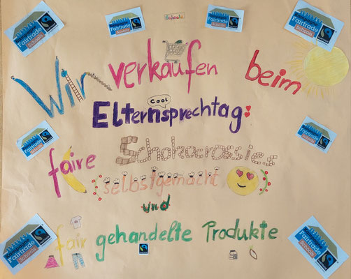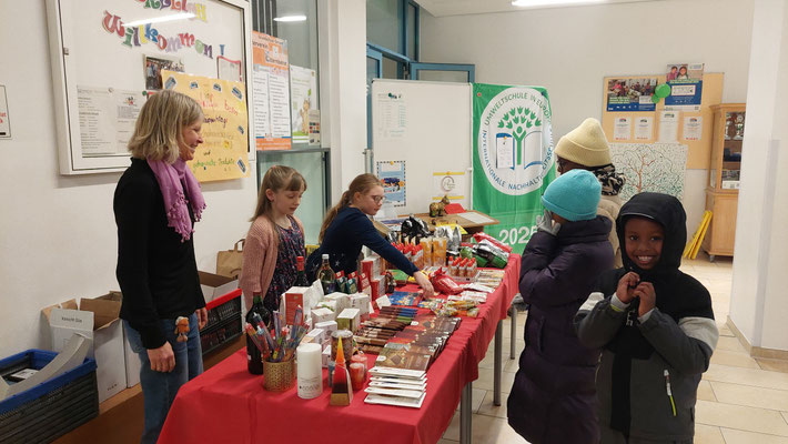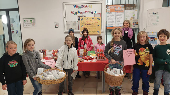 Das diesjährige Fairtrade-Schulteam (bestehend aus über dreißig Dritt- und Viertklässlern und einigen engagierten Müttern und unter der Leitung unserer Fairtrade Expertin Martina Reiner) hatte sich zum Thema fair gehandelte Schokolade überlegt, Schokocrossies selbst herzustellen, diese in selbstgestaltete Tüten zu packen und diese dann an den Fairtrade-Ständen am Elternsprechtag und am Nikolausmarkt zu verkaufen.