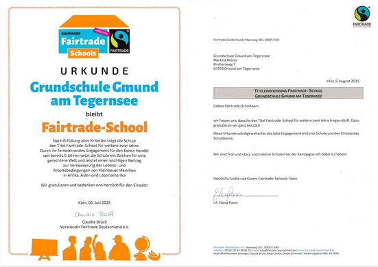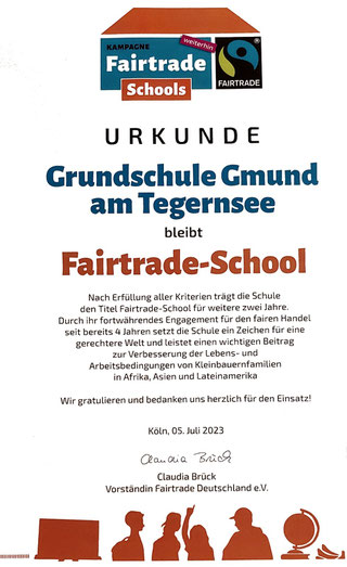 Wir sind froh, Ihnen jetzt mitteilen zu können, dass die Grundschule „Grundschule Gmund am Tegernsee“ den Titel „Fairtrade-School“ für weitere zwei Jahre tragen darf. Herzlichen Glückwunsch an